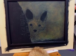 Little Foxy is in nature so a green is a natural choice. There are a lot of greens out there. I chose a few yellow greens to start with. Adding a yellow is nice to warm things up and reflect a bit of “Fox Colour”. And then a brighter colour to add some punch. I just go through my original choices of colours adding them here and there, looking at them, making my choices. I soon disregard the photo and make the background what I want and what I decide is best for my subject. I think of value as I place my blotches. Where do I want the darks and lights?